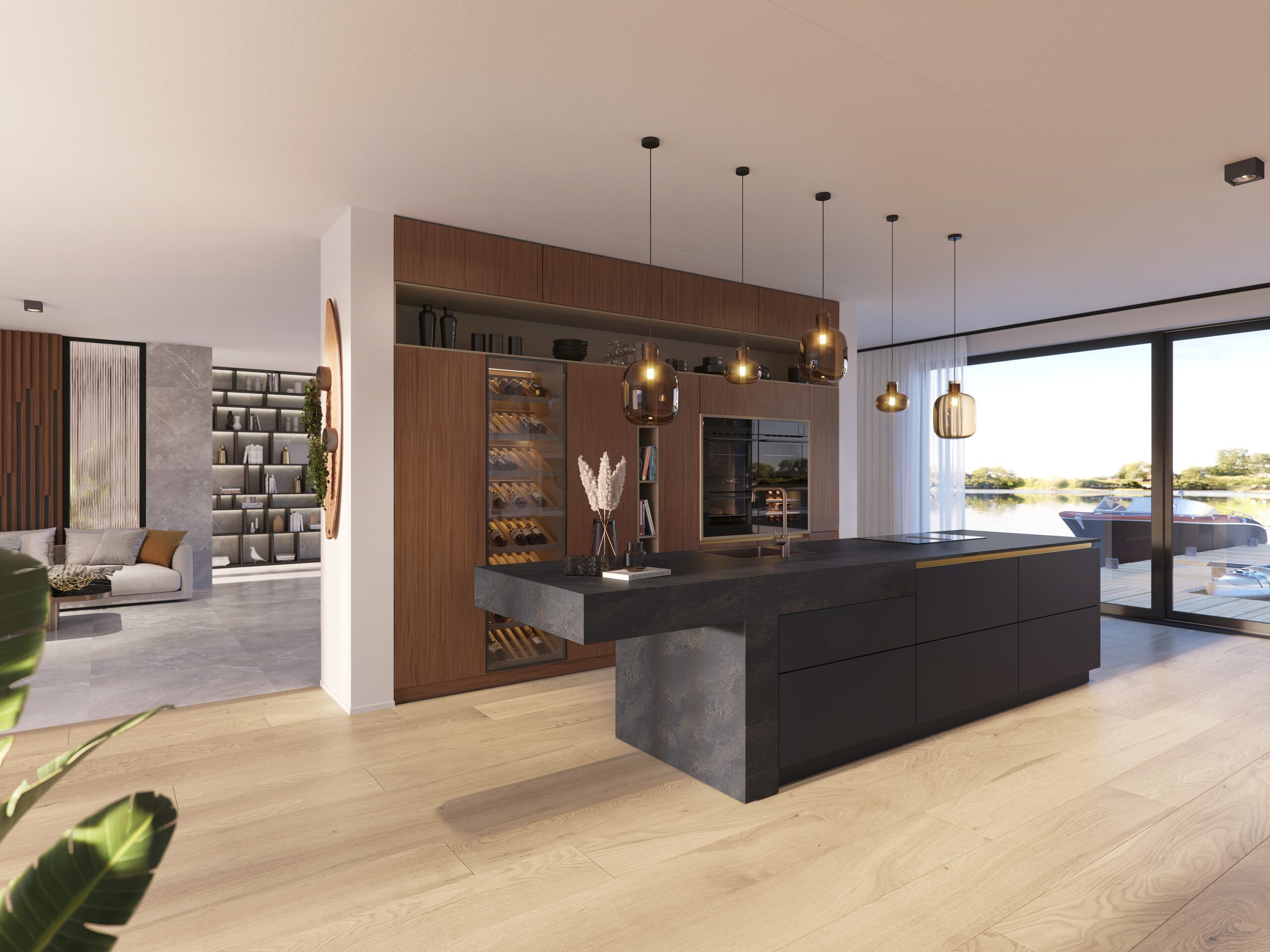 Hout komt terug in vloeren, wandpanelen en meubels, terwijl steen zorgt voor een stijlvol contrast. Samen zorgen ze voor een tijdloze basis die jarenlang meegaat.