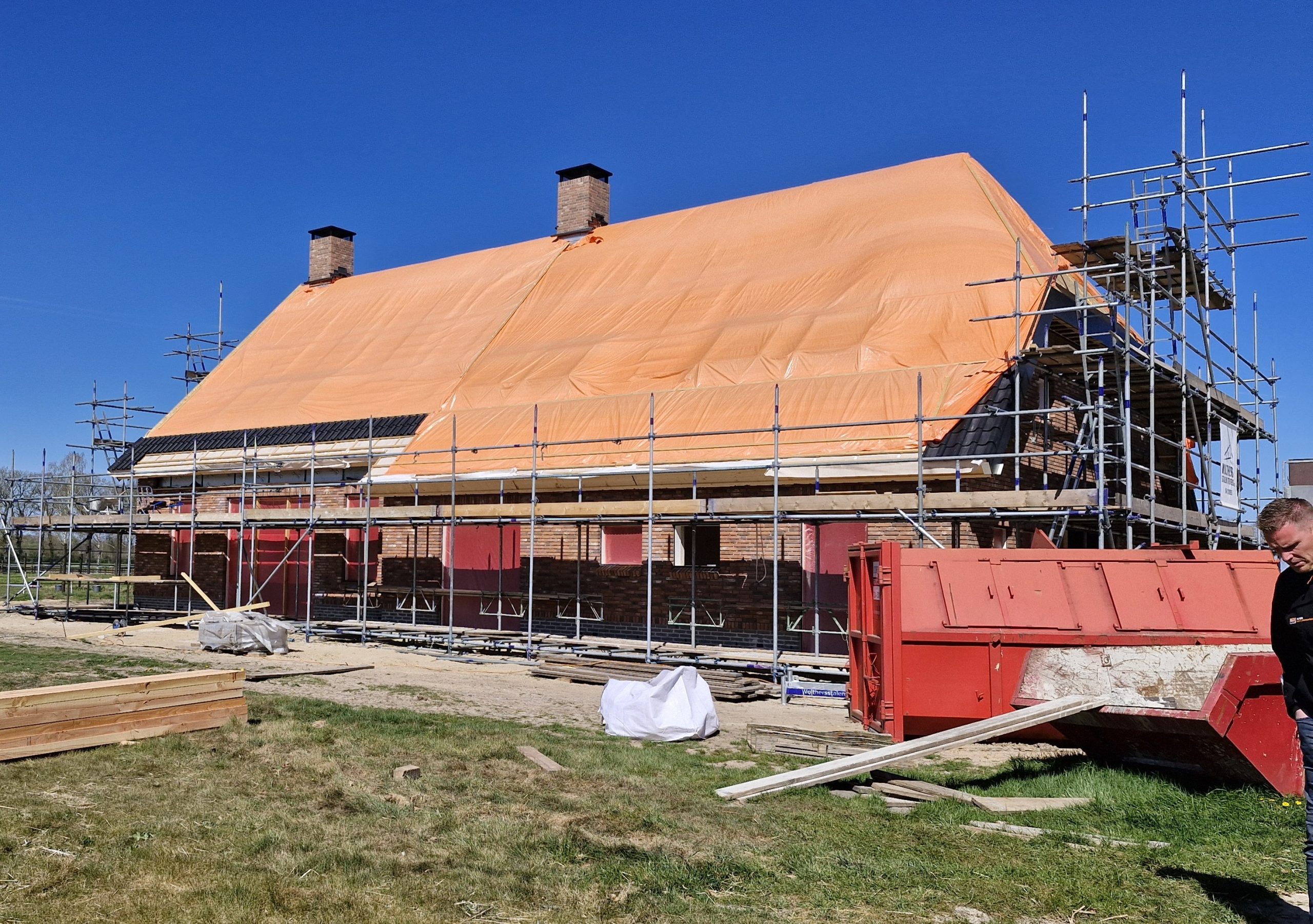 Hoewel de woning zich nog midden in de bouwfase bevindt en de steigers nog om het huis staan, is het eindresultaat al goed voor te stellen. De contouren zijn zichtbaar, de indeling spreekt tot de verbeelding, en het geheel belooft een warme, stijlvolle woning te worden die perfect past in haar omgeving.